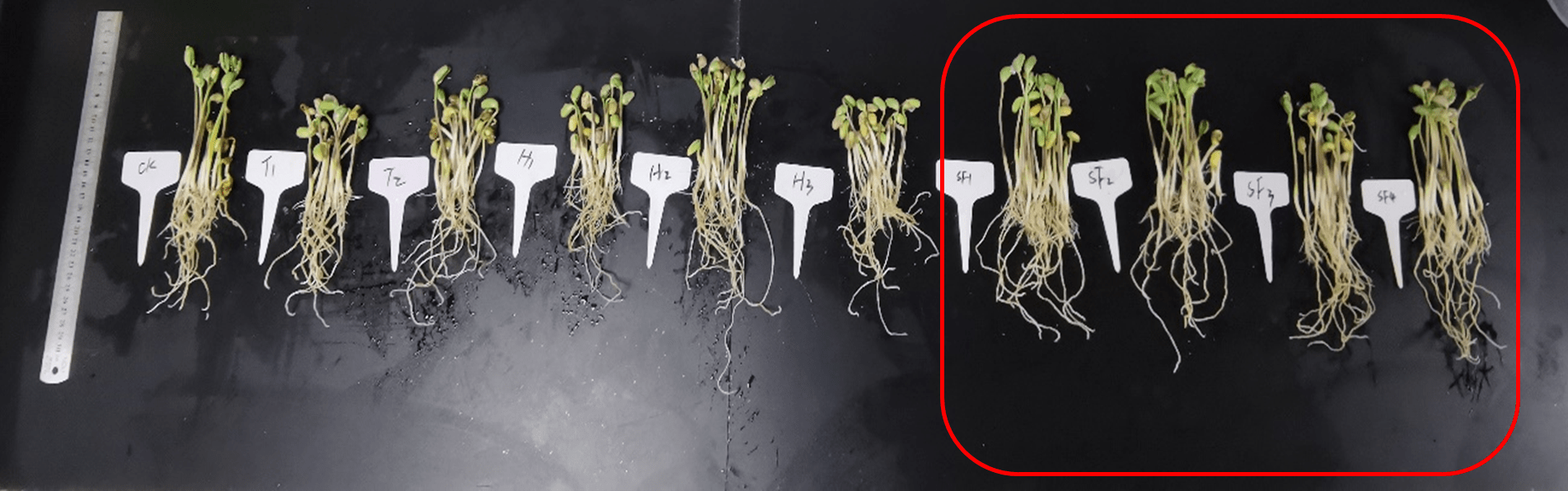 (2)測(cè)試了在低溫與高溫條件下,花粉多糖對(duì)大豆幼苗生長(zhǎng)的影響。對(duì)比其他生物刺激素,花粉多糖在高低溫逆境條件下,可顯著促進(jìn)大豆根長(zhǎng)、莖粗及鮮重增加,其中高溫條件下大豆根長(zhǎng)根重分別增加了20.45%、55.58%,顯著優(yōu)于其它生物刺激素效果。