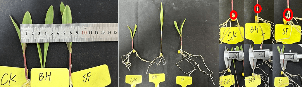 (1)針對(duì)玉米作物:在14℃~22℃培養(yǎng)條件下,對(duì)比其他種子處理劑,采用50g/100kg花粉多糖進(jìn)行玉米拌種處理,試驗(yàn)27天后發(fā)現(xiàn),花粉多糖處理后玉米株高生長(zhǎng)雖弱于其他種子處理劑,但莖粗、根鮮重、氣生根長(zhǎng)出率及氣生根根長(zhǎng)均顯著優(yōu)于,其中明顯看出其他種子處理劑處理后,玉米未生長(zhǎng)出氣生根。說明花粉多糖拌種玉米,可明顯增加玉米氣生根生長(zhǎng),提升玉米后期抗倒伏能力。