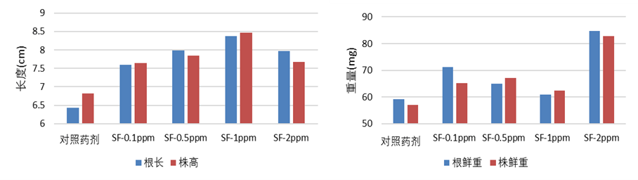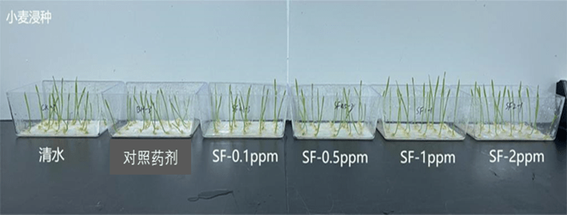 (2)針對(duì)小麥作物:浸種處理后發(fā)現(xiàn),試驗(yàn)范圍內(nèi)的花粉多糖對(duì)小麥株高、根長(zhǎng)、株重、根重均具有促進(jìn)作用,其中在2 ppm處理下,相比陽性對(duì)照處理,花粉多糖處理后小麥株高、根長(zhǎng)、株重及根重分別增長(zhǎng)12%、24%、45%、43%。