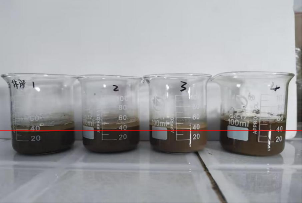 試驗(yàn)方法:取相同板結(jié)地塊過(guò)0.5mm篩40g土樣4份加入4個(gè)100ml燒杯中,加水20ml,充分?jǐn)嚢韬箪o置沉淀。