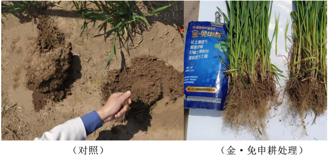 試驗(yàn)結(jié)果:金·免申耕使用后的土壤明顯疏松,小麥長(zhǎng)勢(shì)強(qiáng),分蘗多,根系好。